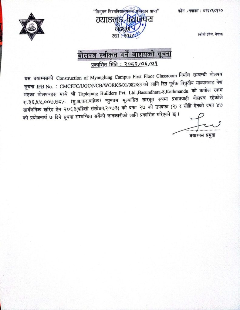 बोलपत्र स्वीकृत गर्ने आशयको सूचना २०८२, १ आश्विन बुधबार २०:५८ campus मध्यान्ह राष्ट्रिय दैनिकको पेज नं ६ मा प्रकासित सूचना हेर्नको लागि यहाँ क्लिक गर्नुहोस